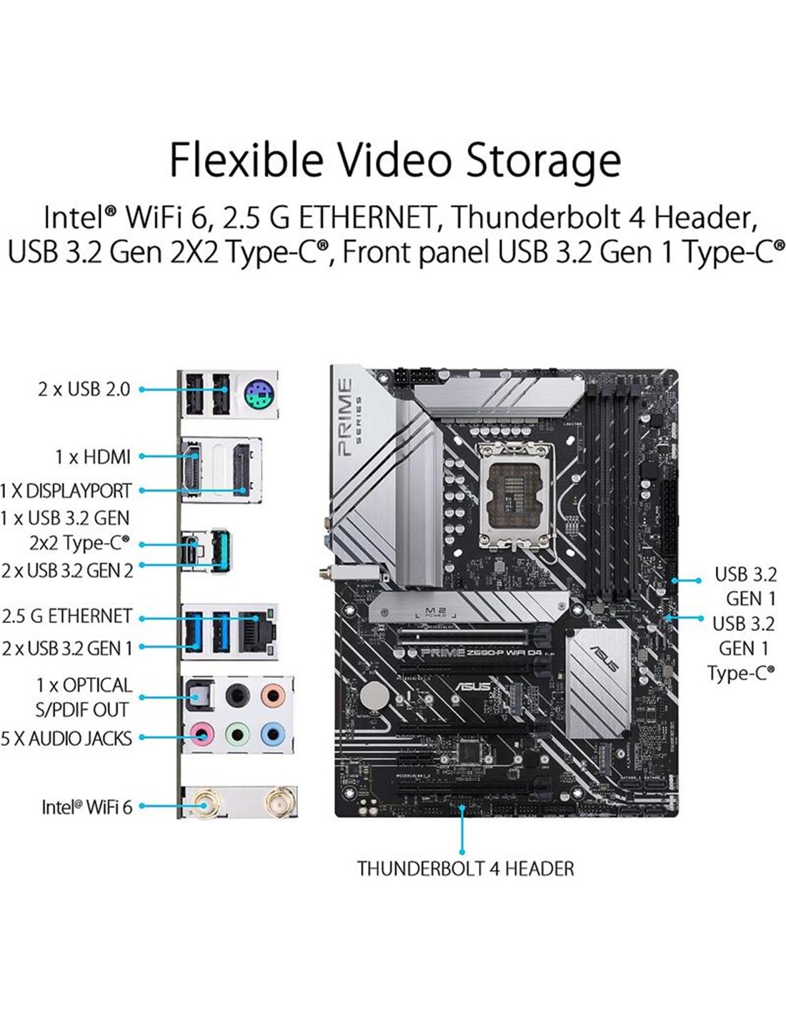 - Conectividad de próxima generación: Intel® WiFi 6, DDR4, PCIe® 5.0, Ethernet de 2,5 Gb, USB 3.2 Gen 2x2 Type-C®, USB 3.2 Gen 1 Type-C® del panel frontal, soporte de encabezado Thunderbolt ? 4