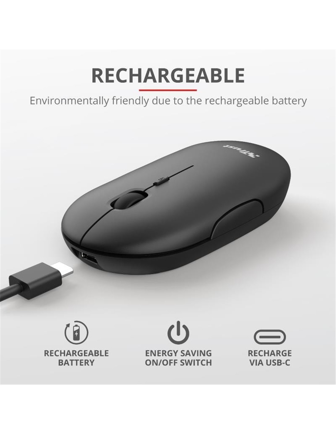 Gracias a la batería recargable, no tendrá que volver a comprar baterías desechables. Cuando el ratón se esté quedando sin batería, simplemente conéctelo con el cable USB-C incluido y listo. Ahorrará dinero y ayudará a proteger el medio ambiente.