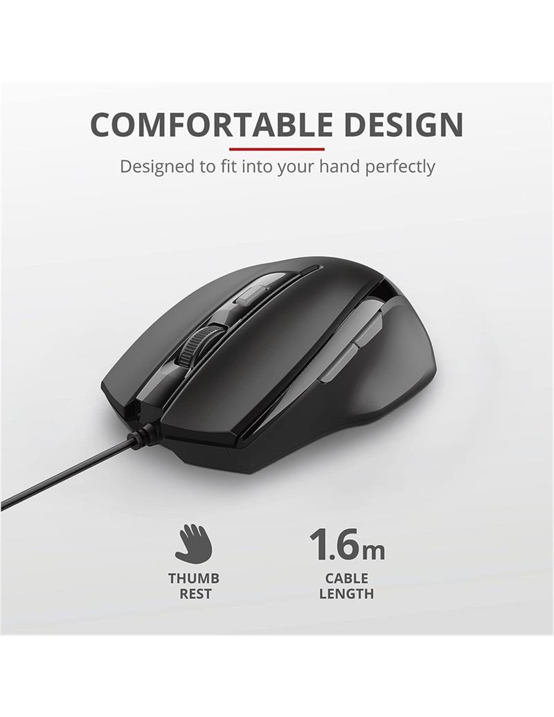 - Ratón con cable, con un diseño cómodo para trabajar con facilidad.