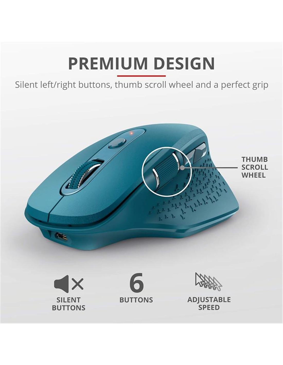 - Seis botones, entre ellos, botones derecha/izquierda de silenciamiento, junto con una rueda de desplazamiento de pulgar para el desplazamiento horizontal
