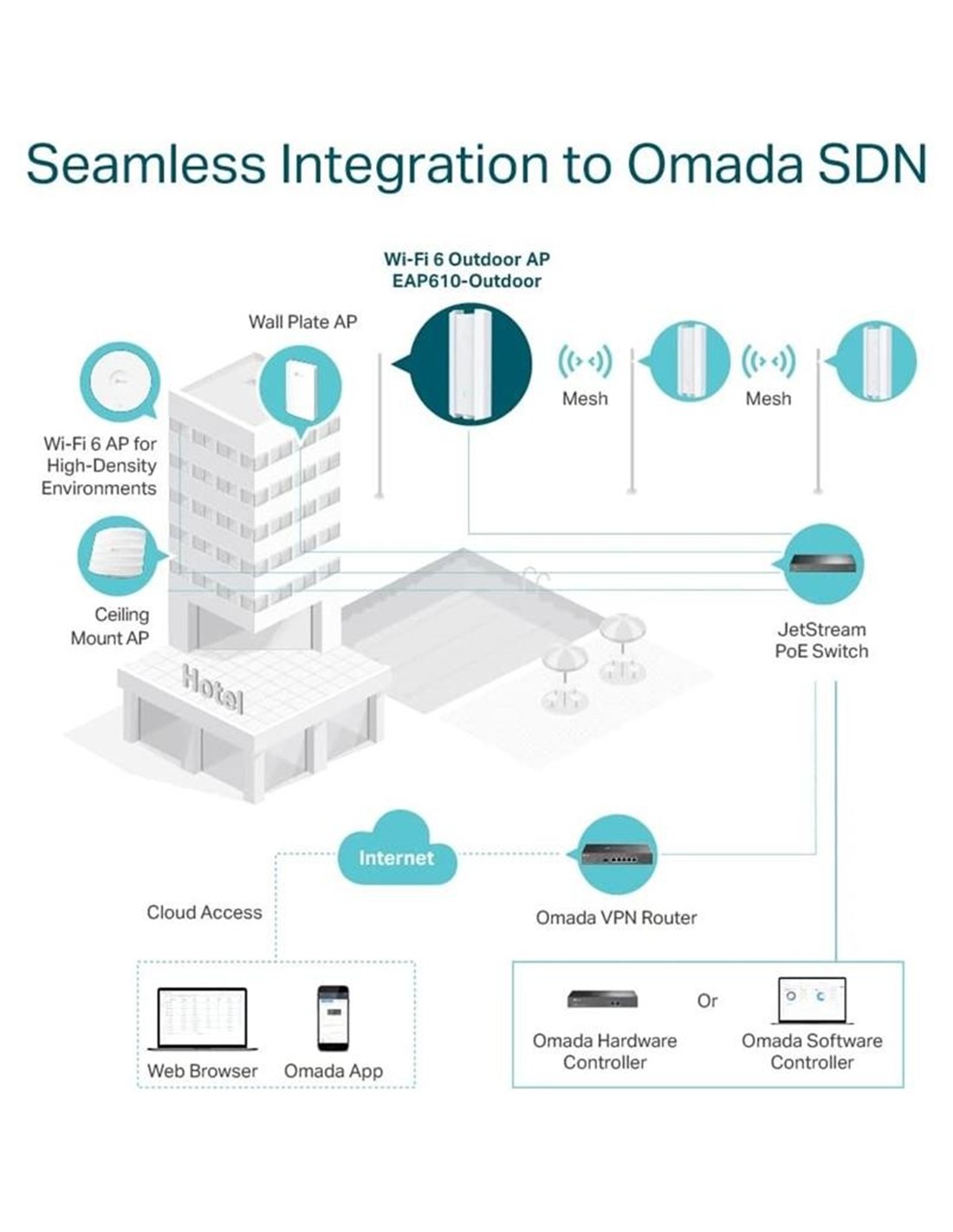 - Emparejamiento fácil, menos cableado: Con la tecnología Mesh, los EAP de Omada le ahorran cables adicionales al extender de forma inalámbrica su señal WiFi de manera más amplia y flexible a áreas difíciles de cablear.