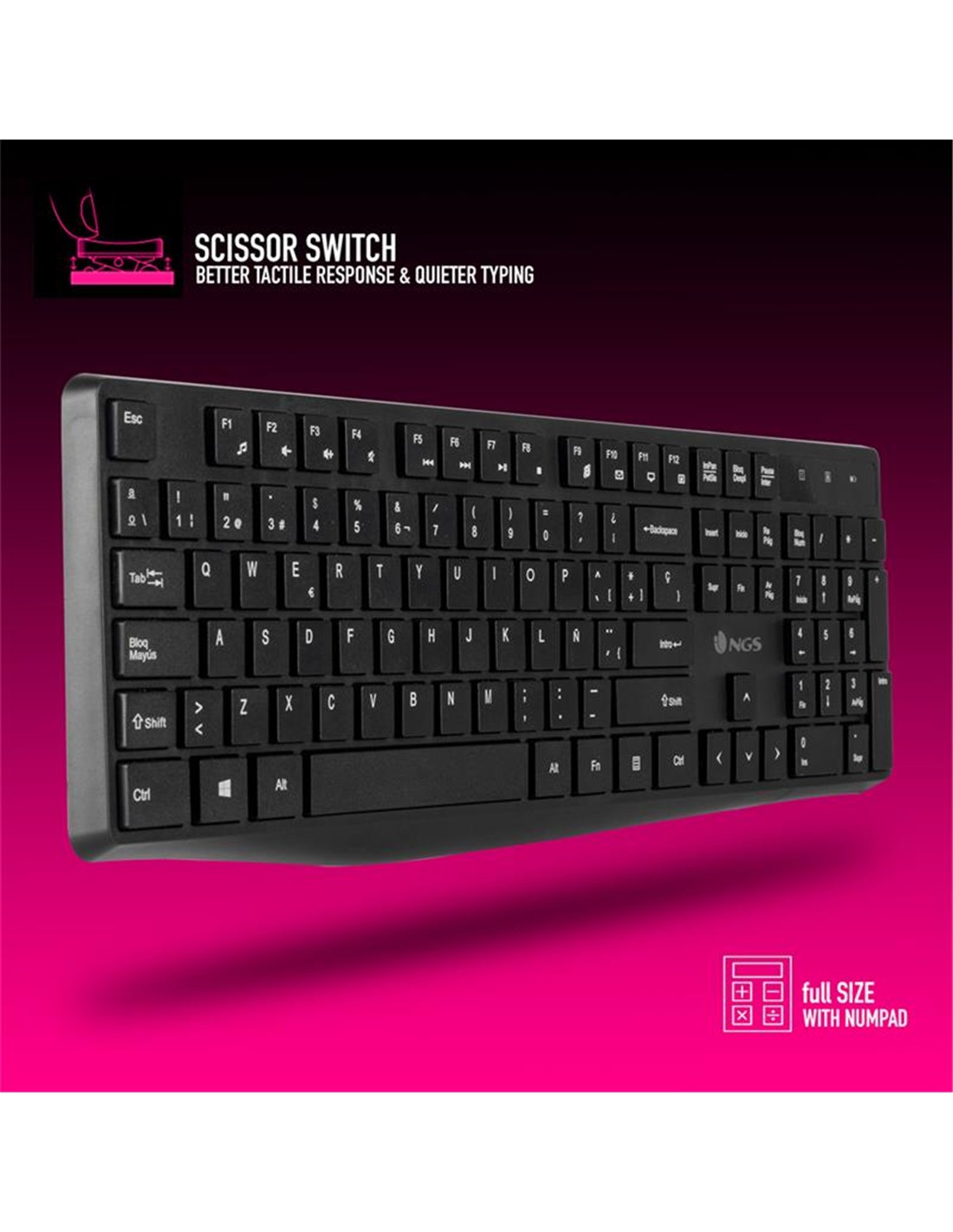 Su teclado presenta un diseño de tamaño completo con teclado numérico. Cuenta con 12 teclas FN + multimedia que hacen más fácil y rápido el acceso a las distintas aplicaciones del ordenador y sus habituales funciones. Así como indicadores LED para Mayúsculas, Bloqueo Numérico y nivel de batería baja.