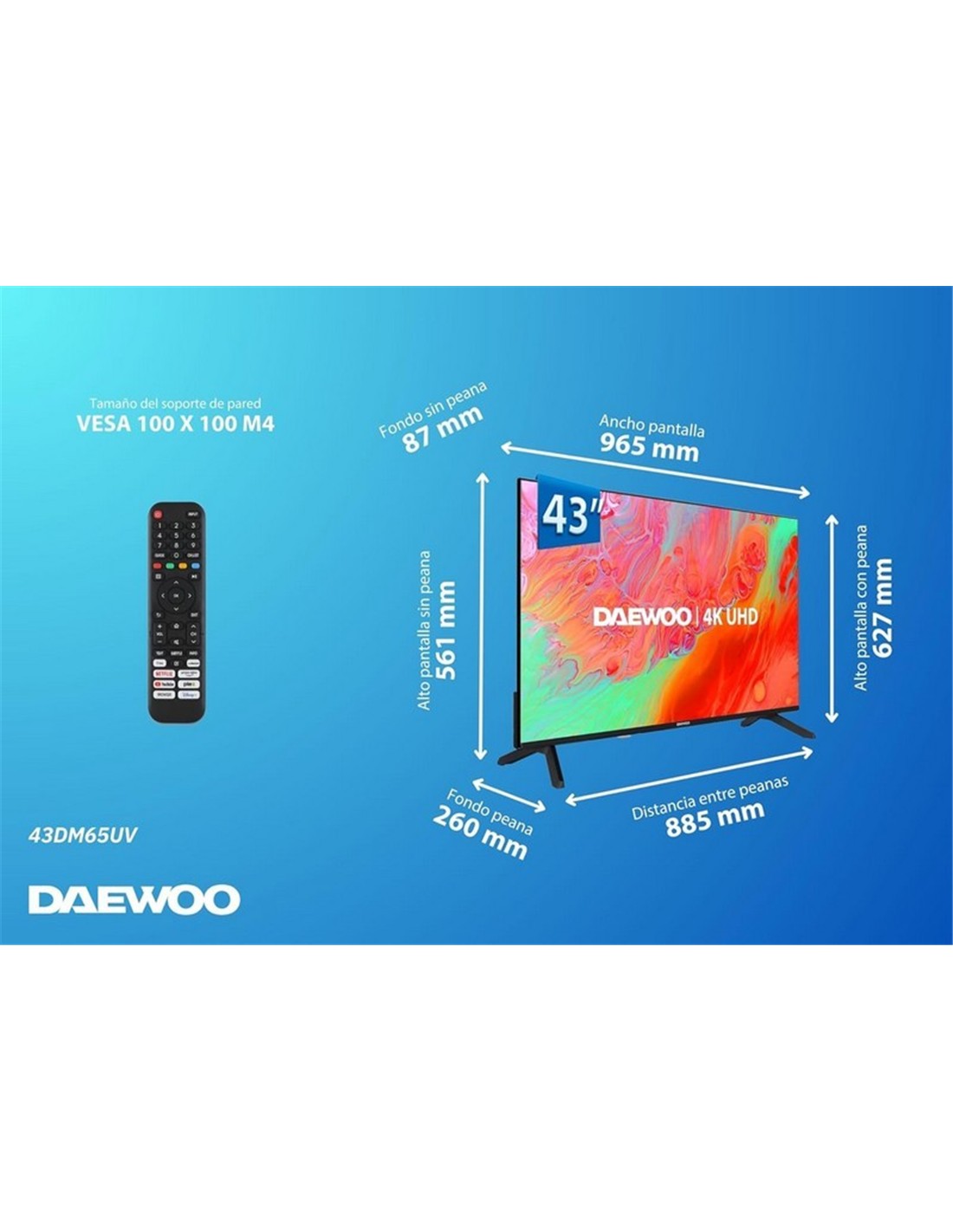 - Dimensiones: 965×561×87 mm (sin peana) – soporte VESA 100×100 mm