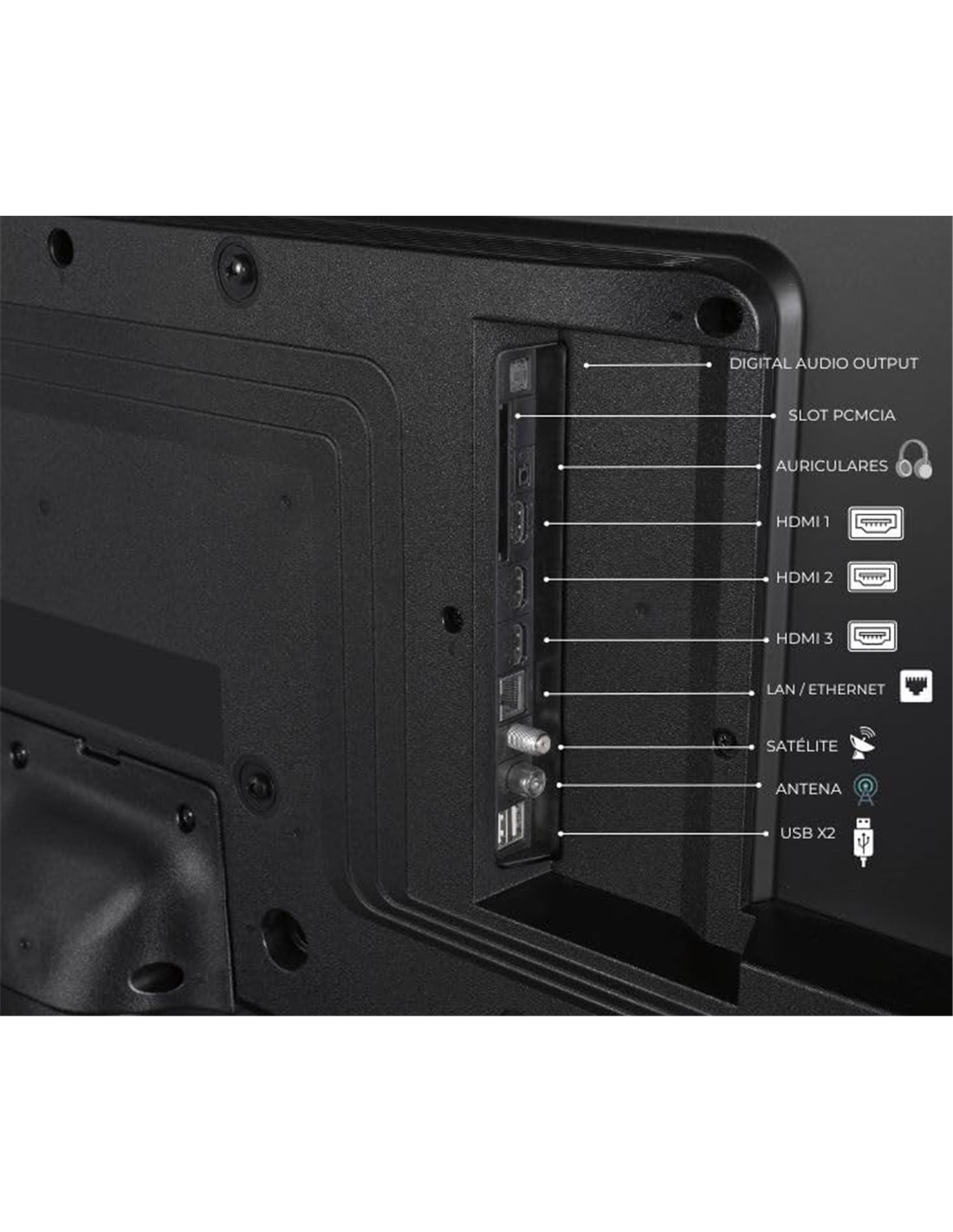 - Puertos: 3× HDMI, 2× USB (PVR ready), salida óptica, toma para auriculares