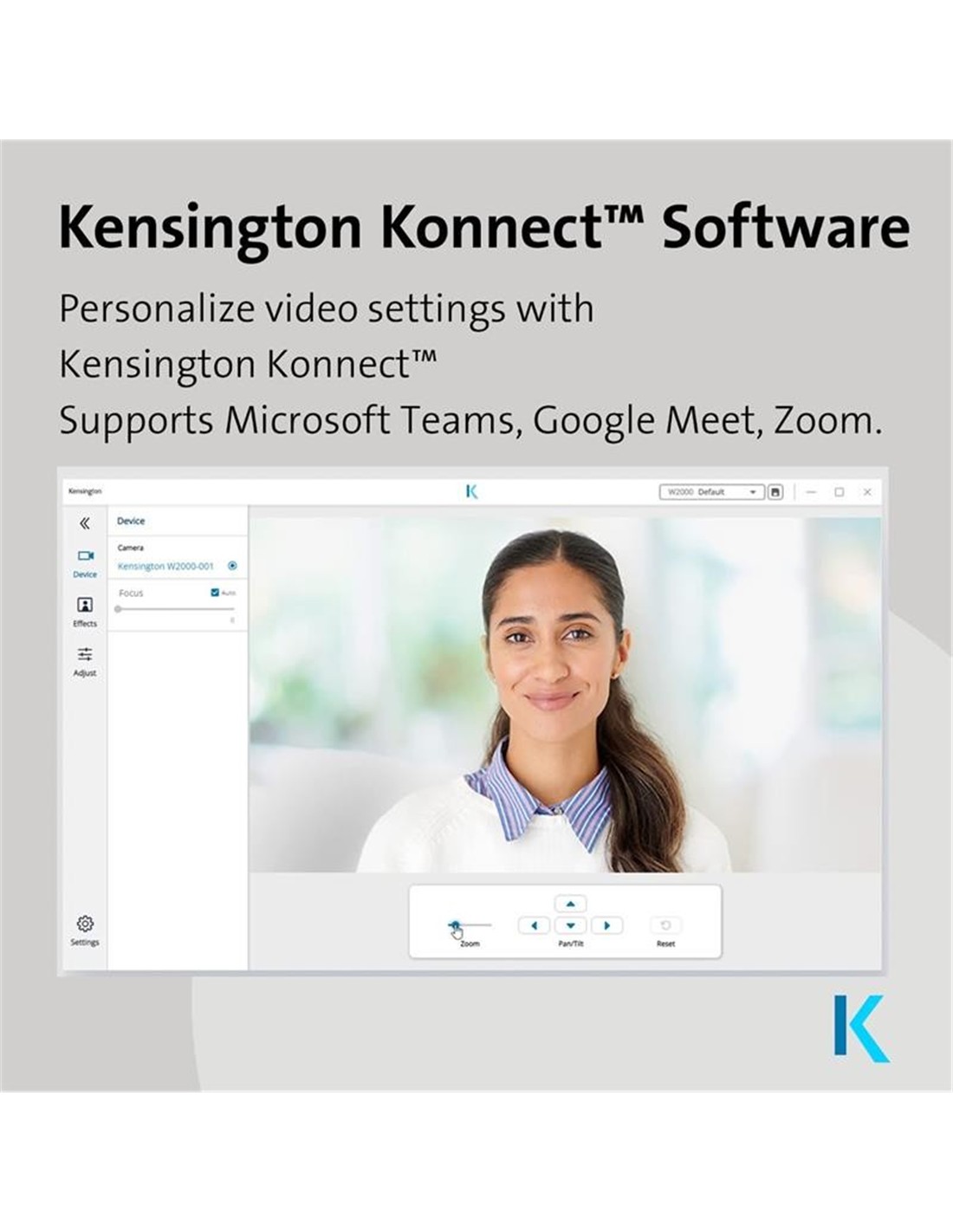 La Webcam W2000 1080p Auto Focus de Kensington ofrece vídeo de alta calidad (1080p a 30 fps), un micrófono omnidireccional y características únicas de privacidad, colocación de la cámara y generación de imágenes en condiciones de poca luz. La W2000 está diseñada para ayudarle a tener buen aspecto en las modernas aplicaciones de videoconferencia y forma parte del ecosistema de videoconferencias profesionales de Kensington, una potente experiencia de software y accesorios cohesionada que le ofrece todo el potencial que necesita para pasar más tiempo colaborando y menos resolviendo problemas. Tanto si trabaja desde casa o en la oficina, la W2000, simplemente, mejora su aspecto en Microsoft Teams, Google Meet, Zoom, etc.